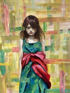 2022Erg verfrissend schilderij met verrassende kleurcombinatie van meisje met strik om jurk.